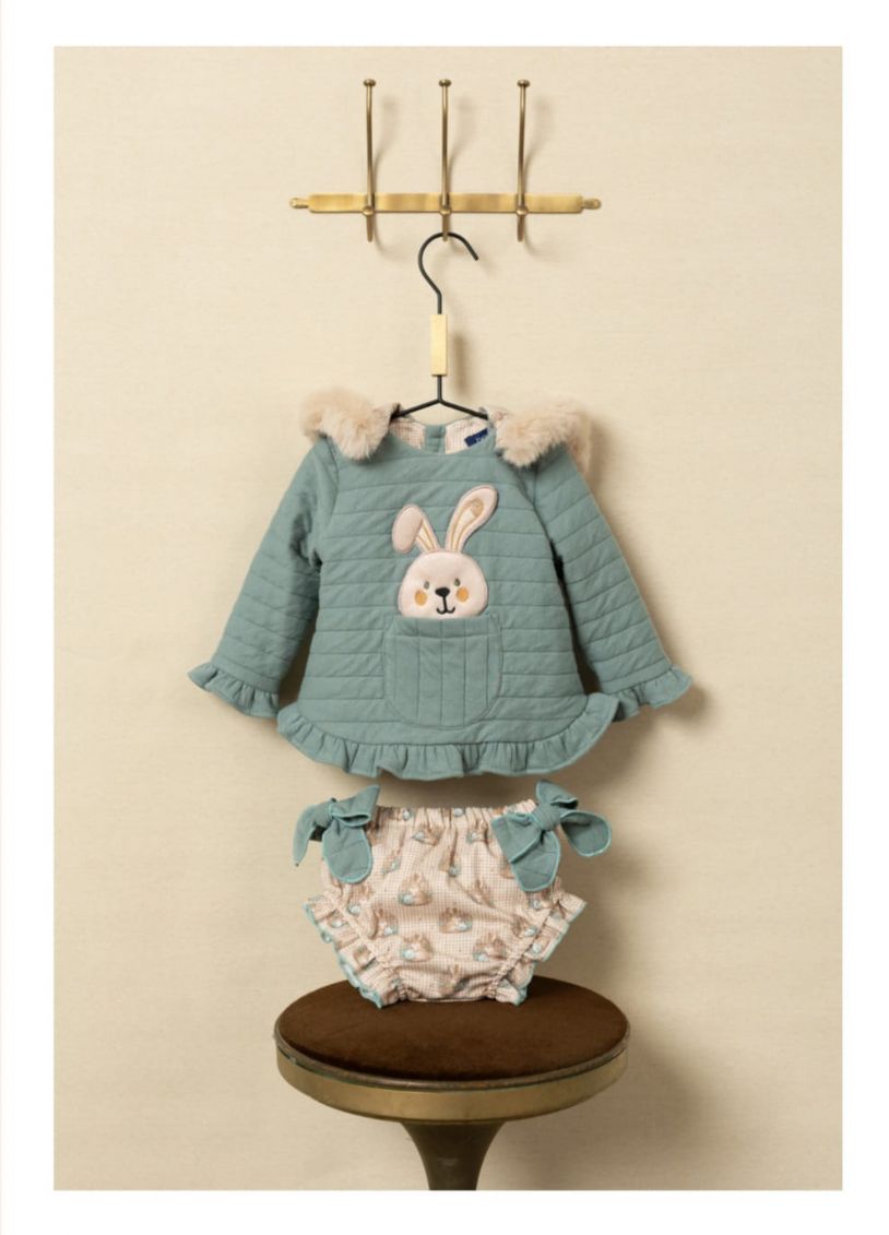 Jesusito de dos piezas en color verde con un conejo.