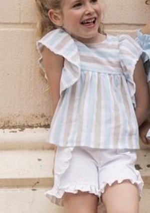 Conjunto de dos piezas con blusa de rayas en color azul y pantalón en color blanco