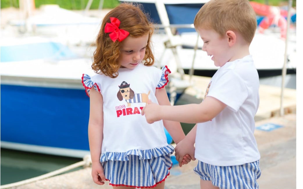 Conjunto de niña en color azul con un perro pirata.Pequeños Piratas.