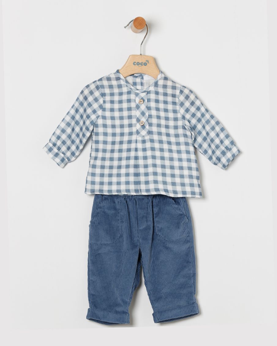 Conjunto de niño con camisa de cuadros y pantalón largo en color azul.