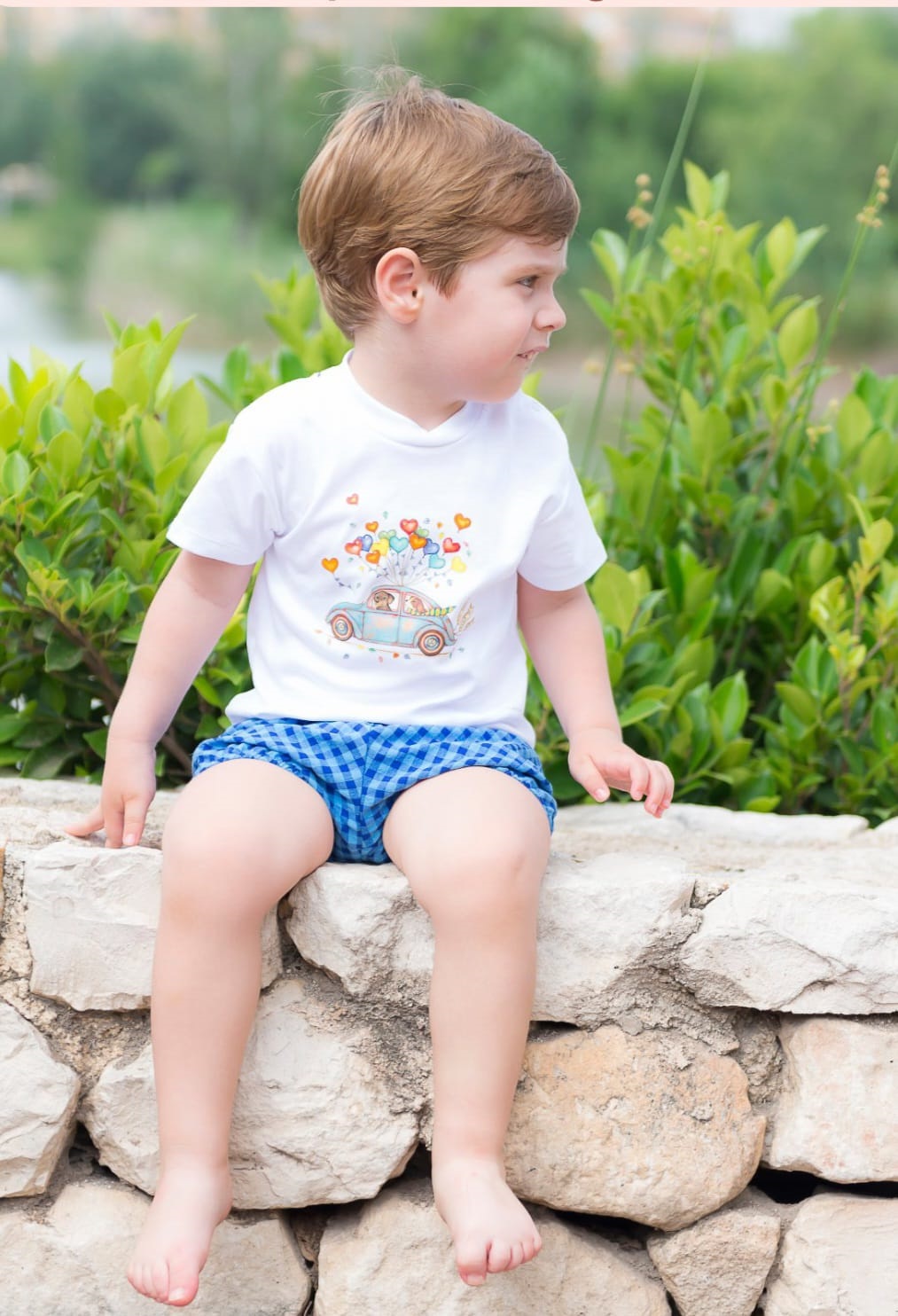 Conjunto de niño con pantalón corto en color azul con un coche.