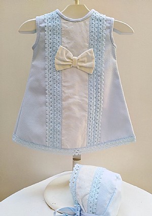 Faldón con capota en color celeste.Con puntillas y lazo en el centro.En piqué.