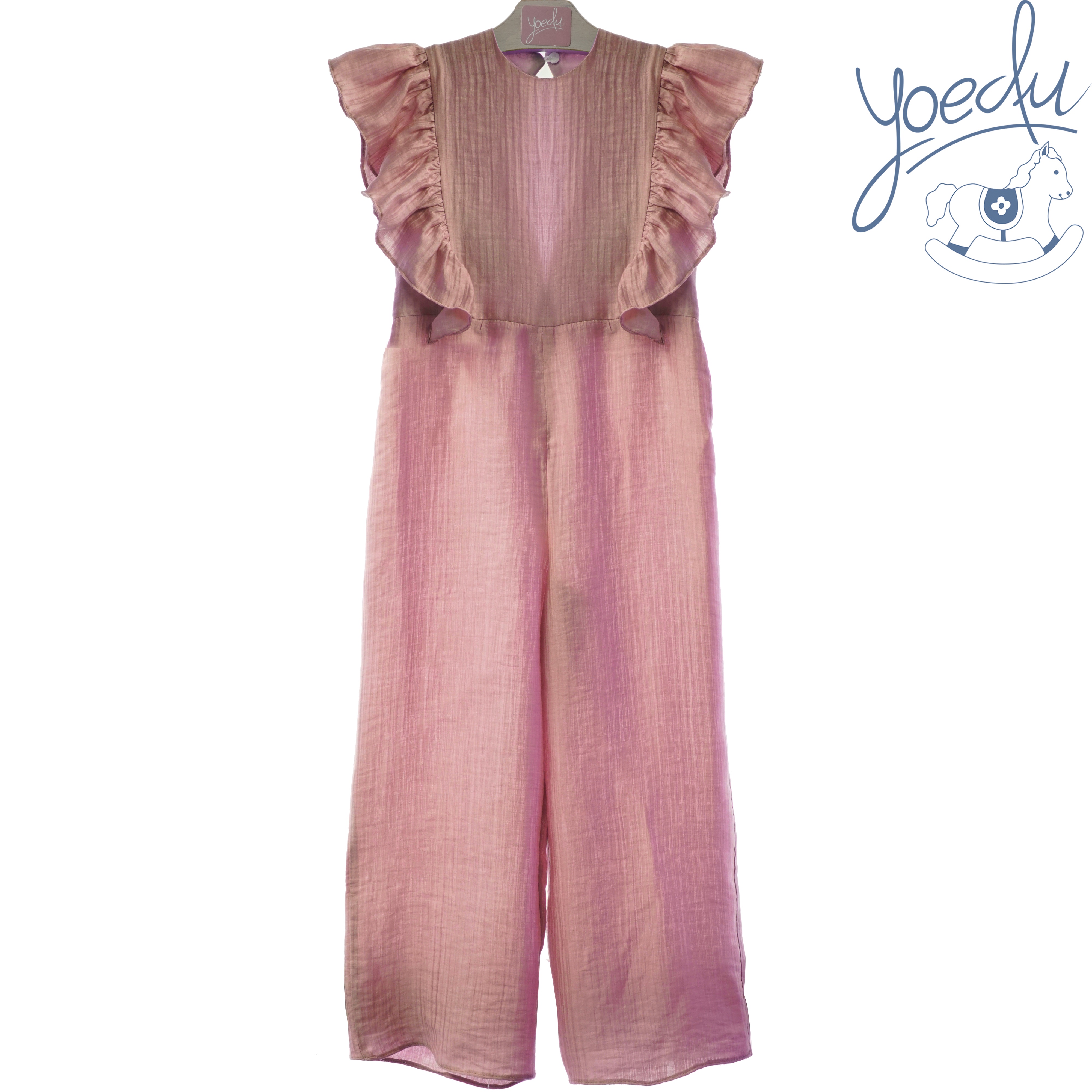 Mono infantil en color rosa empolvado con croché en color beig.