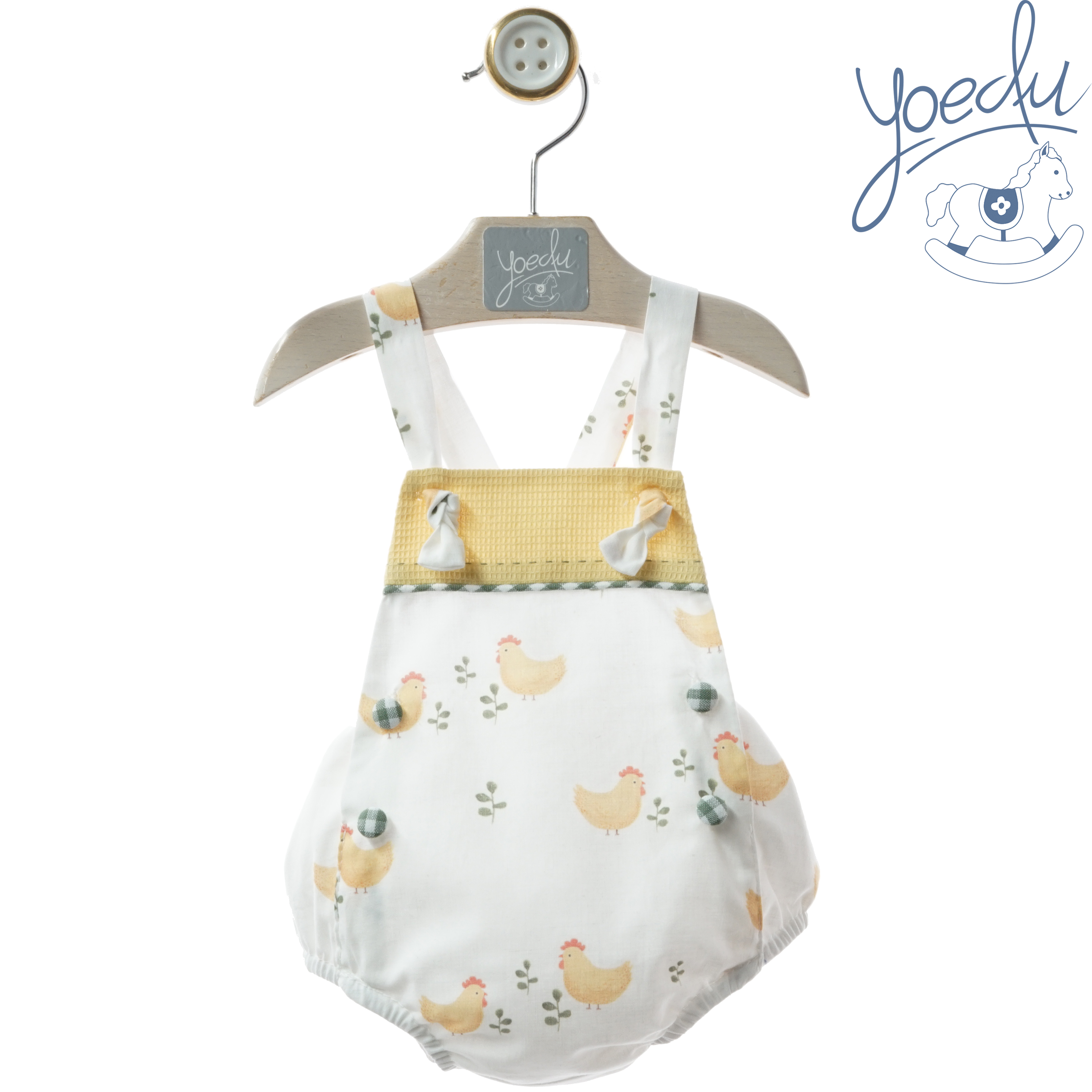 Ranita bebé  de tirantes en color blanco con pollitos en color an¡marillo.