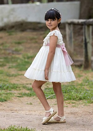 Vestido de ceremonia en color crudo con lazo en color rosa.