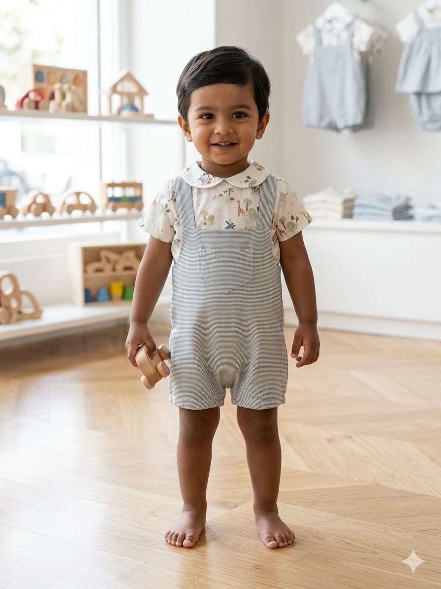 Conjunto de niño con peto en color azul y camisa con jirafas.