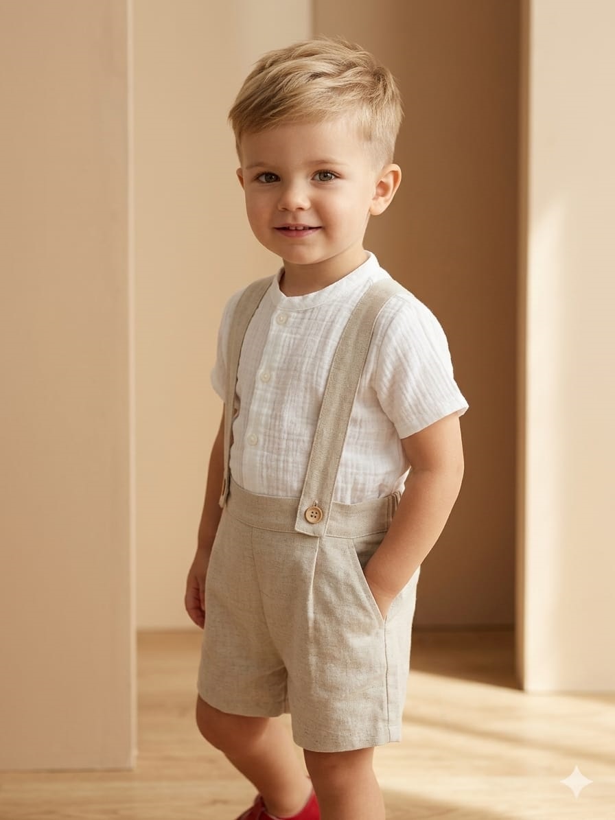 Conjunto de niño de dos piezas con tirantes en color crudo.