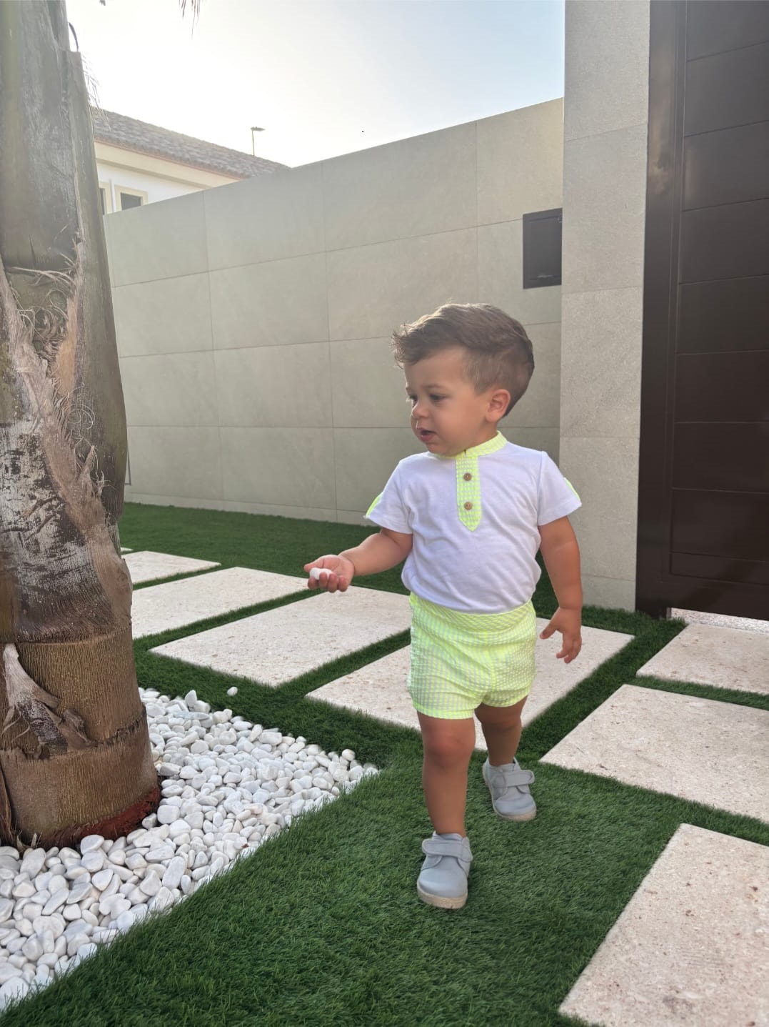 Conjunto de niño con camiseta en color blanco y pantalón corto en color verde.