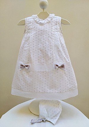 Faldón con capota en color blanco y detalles en gris.En batista,Con puntilla en color blanco.
