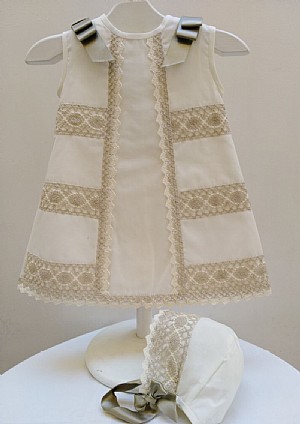 Faldón con capotaen batista.En color crudo.Dos lazos en los hombros en color verde.Puntillas por todo el frente.
