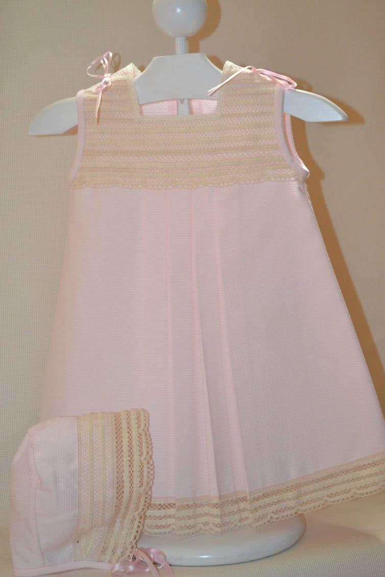 Faldón piqué con capota.Lleva puntilla en crudo en el pecho y en la parte de abajo.