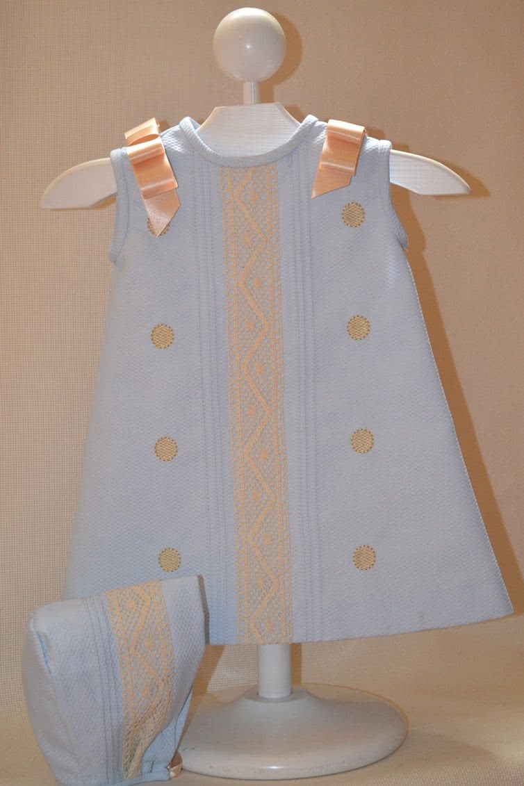 Faldón de piué con capota. En color celeste, con detalles en camel y dos lazos en los hombros.