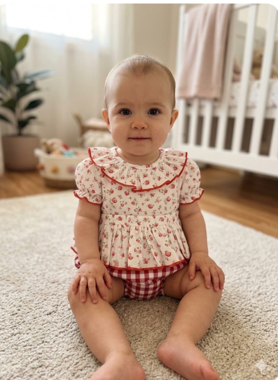 Jesusito de niña de piezas con florecitas en color rojo.