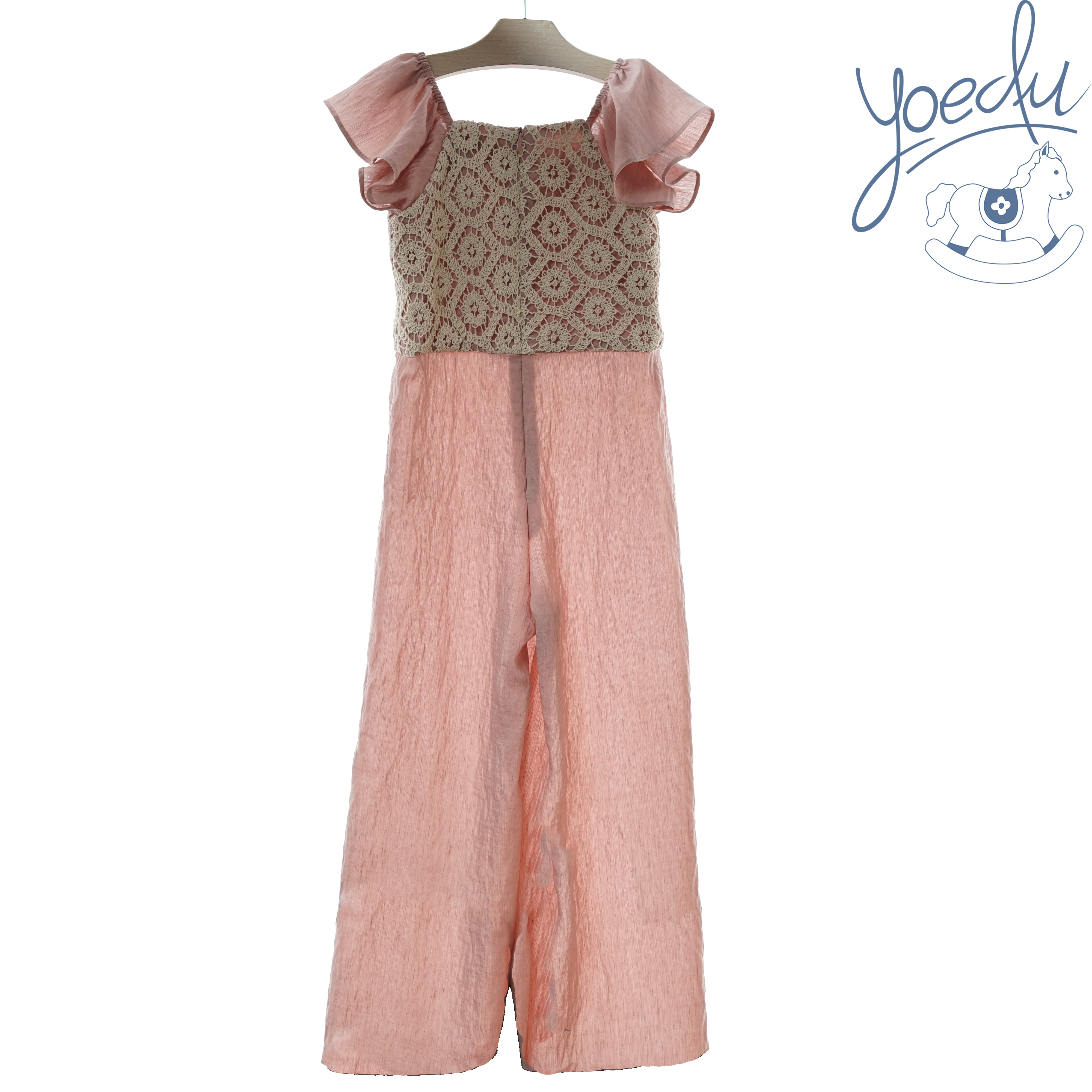 Mono infantil en color rosa empolvado con croché en color beig.