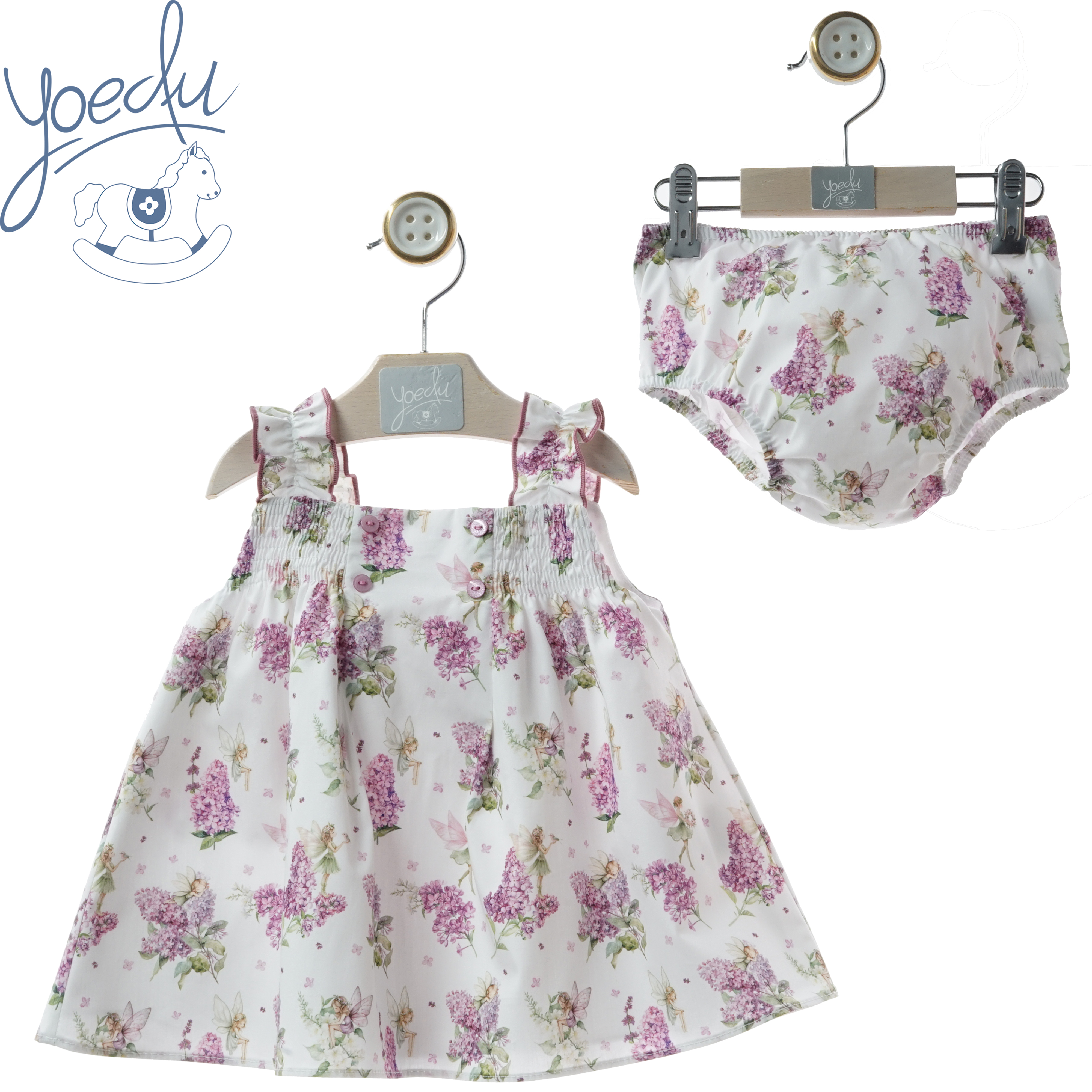 Vestido bebé con braguita en color blanco y florecitas en color morado.