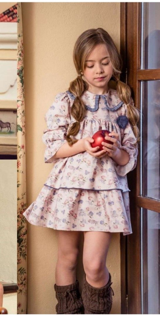 Vestido infantil en color rosa con florecitas y pompóm en color azul.